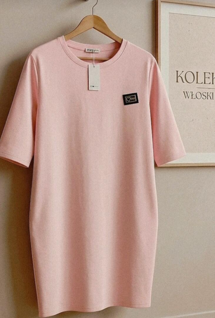 Sprzedam nową sukienke pudrowy róż z kieszeniami na biust do 120cm długosc 98